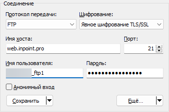 После этого можно подключаться к серверу по FTP с созданными учётными данными, используя любой FTP-клиент (например, FileZilla или WinSCP), указав хост (web.inpoint.pro), логин в формате user_ftpuser, пароль, порт 21 и шифрование SSL.