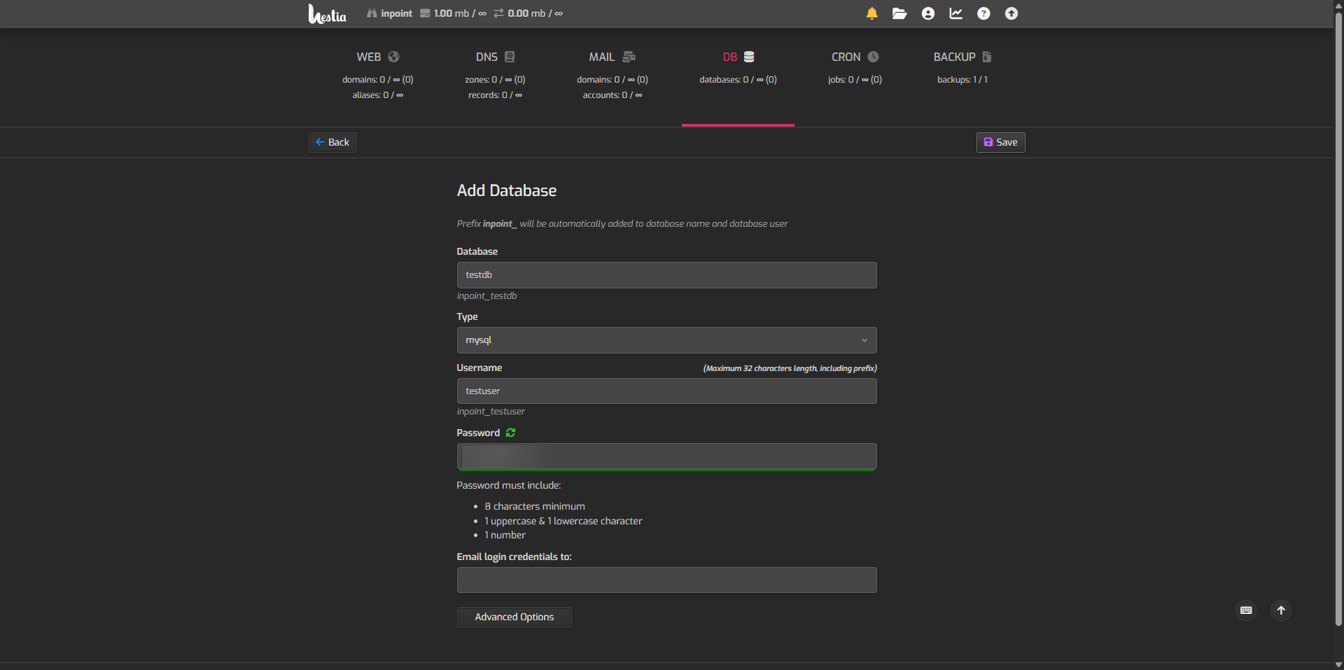 Важно: Панель Hestia автоматически добавит к названию базы и имени пользователя префикс, соответствующий вашему логину в системе (например,