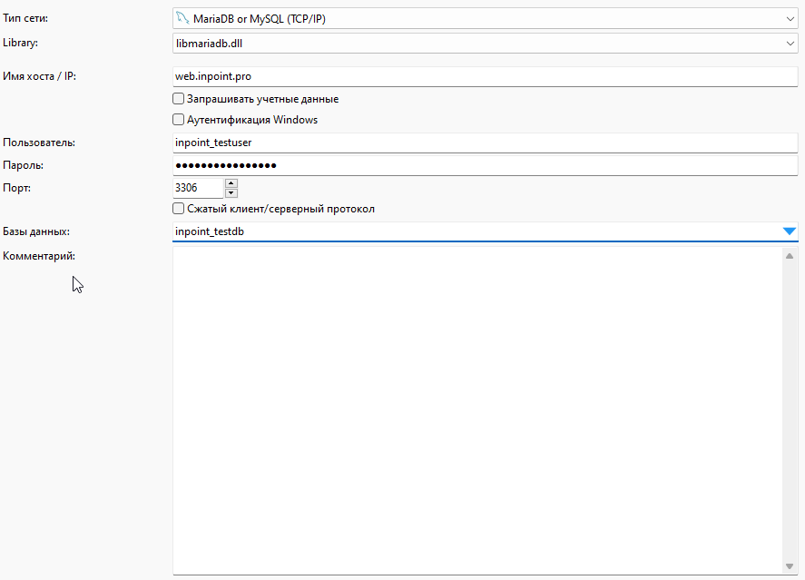 Базы данных: Вы можете оставить это поле пустым, чтобы увидеть все доступные вам базы, или указать конкретное имя БД (с префиксом) для прямого подключения.